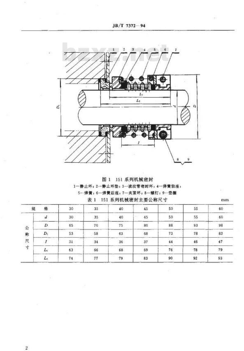 1—静止环:2-静止环整:3波效管密封环:4弹簧前座:5-强簧:6—弹资后座,7—爽紧环,8—螺钉:9~-整匿表1151系列机械密封主要公称尺寸30