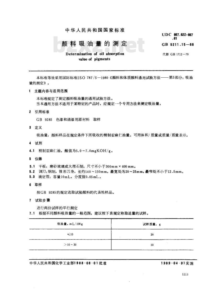 本标准规定了测定颜料吸油量的通用试验方法。当本通用方法不适用于某特定的产品时,应规定一个专用方法来测定吸油量。2引用标准
