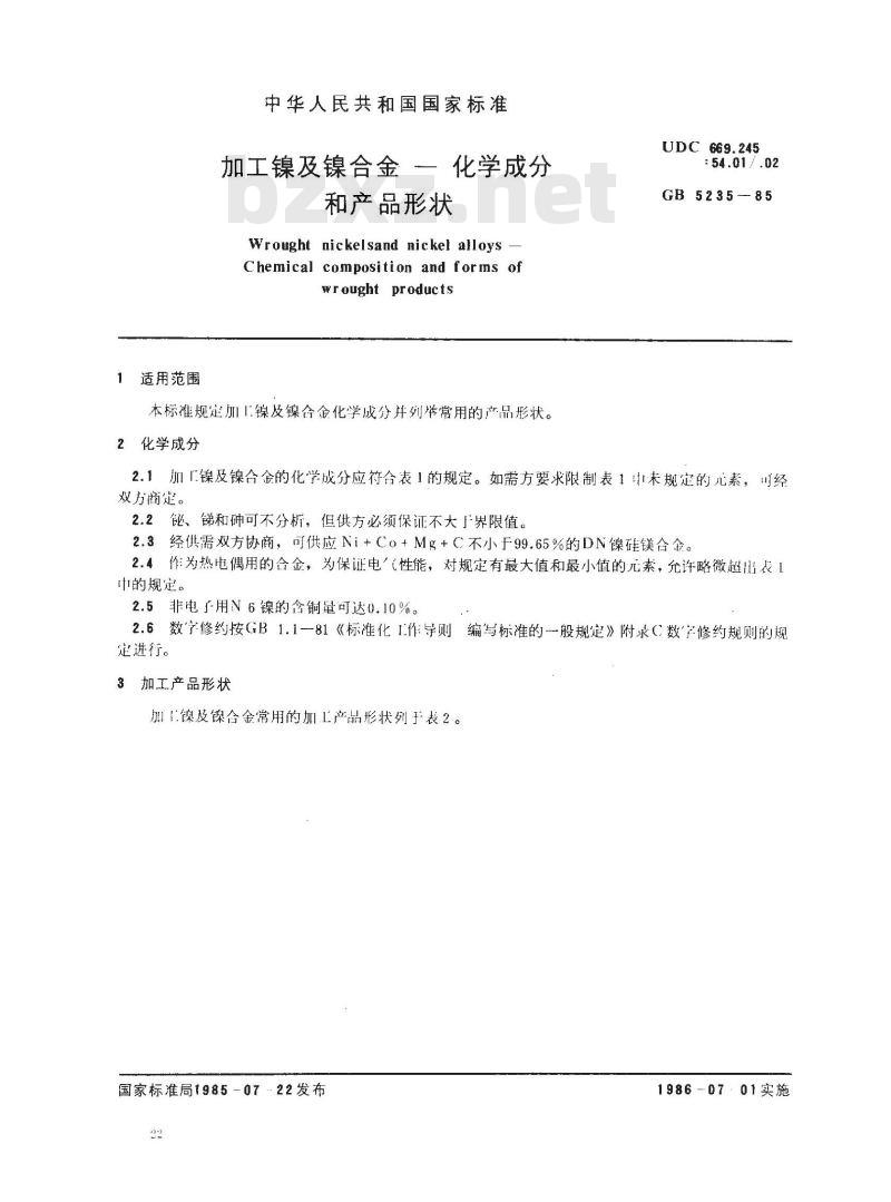 - GB/T 5235-1985 加工镍及镍合金 化学成分和产品形状