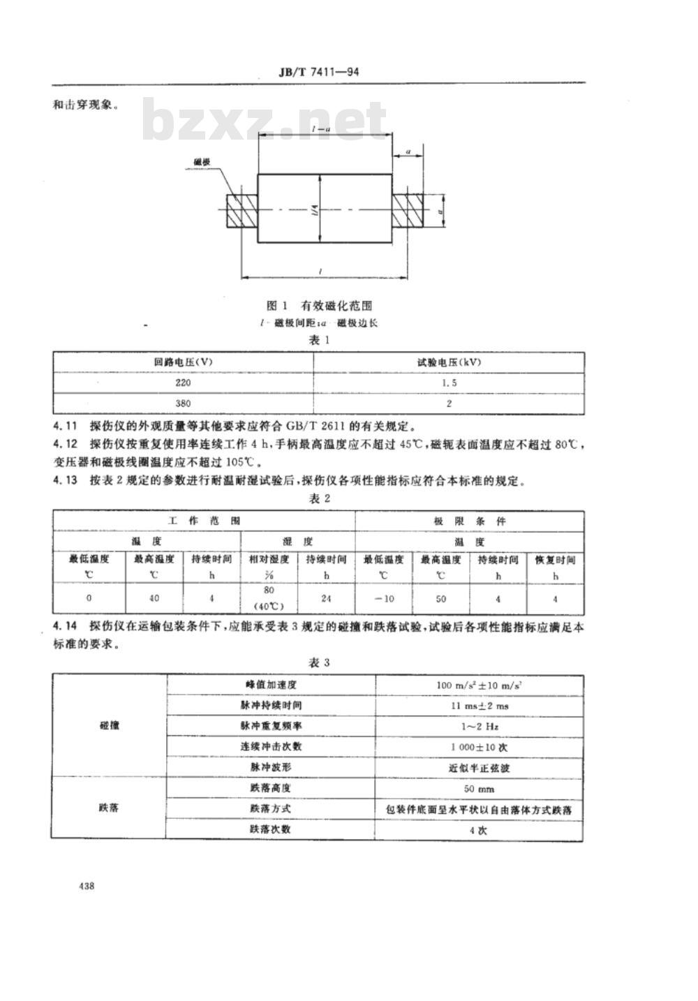 4.7探伤仪的磁化时间不得低于0.5s,重复使用率应不小于50%。4.8带有活动关节磁极的探伤仪,其活动关节应转动灵活自如。4.9探伤仪整机绝缘电阻应不小于5Mα。4.10探伤仪的电源进线与外壳、初级与次级之间应能承受表1规定的试验电压,历时1min面无飞弧中华人民共和国机械工业部1994-08-23批准1995-05-01实施