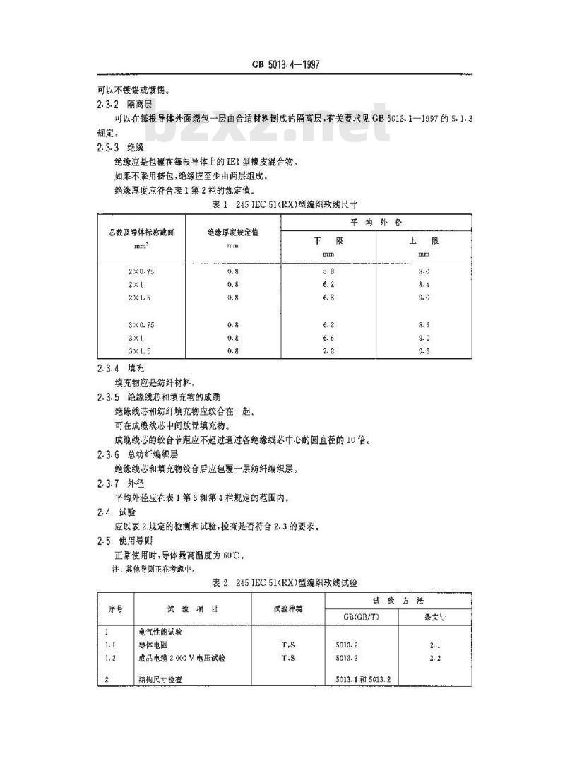 绝缘应是包覆在每根导体上的LE1 型橡皮混合物。如果不来用挤包,绝缘应至少由两层组成。绝缘厚度应符合表1第2栏的规定值。表1245IEC51(RX)型编织软线尺寸芯数及导体标称截面