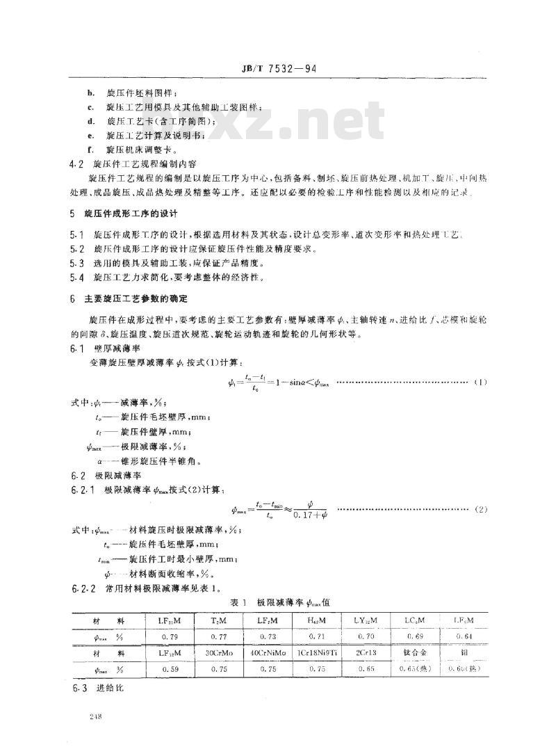 5.1旋压件成形工序的设计,根据选用材料及其状态,设计总变形率、道次变形率和热处埋1艺,5.2旋压件成形工序的设计应保证旋压件性能及精度要求。5.3选用的模具及辅助工装,应保证产品精度。5.4旋压工艺力求简化,要考患整体的经济性。6主要旋压工艺参数的确定