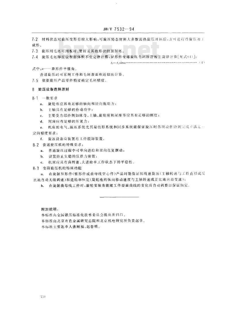 本标准规定了旋压件成形的工艺方案,工艺规程的编制,毛坏的确定和设备的选择本标准适用于金属薄壁,空心回转体璇压件成形工艺。2选用和编制旋压工艺的一般原则2.1根据产品图样设计的旋件,在技本术上是可行的。2.2采用旋压成形方法应是经济合理的,2.3施压成形方法可解决其他加工方法难以成形或尤法成形的工件94