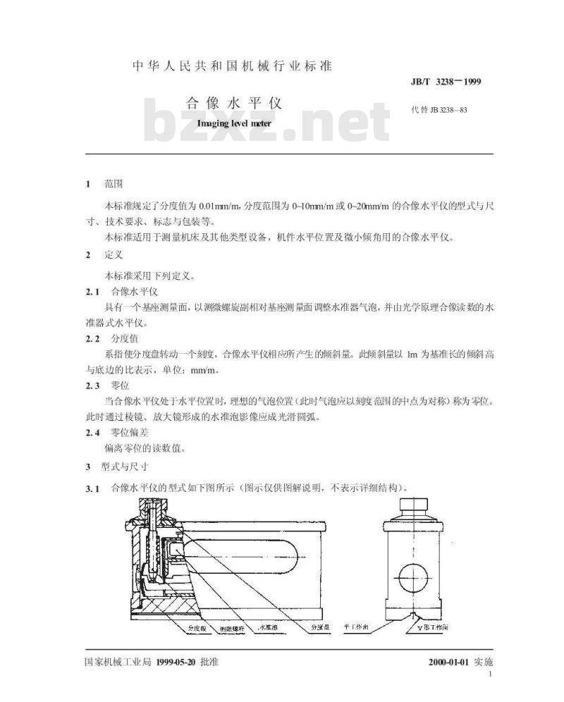 JB/T 3238-1999 本标准是对 JB 3238-83《合像水平仪》的修订,修订时仅按有关规定作了编辑必修改,主要技术内容未改变。 本标准规定了分度值为 0.01mm/m,分度范围为 0~10mm/m 或 0~20mm/m 的合像水平仪的型式和尺寸,技术要求,标志与包装等。 本标准适用于测量机床及其他类型设备,机件水平位置及微小倾角用的合像水平仪。 本标准于 1983 年首次发布。 JB/T 3238-1999 合像水平仪 JB/T3238-1999