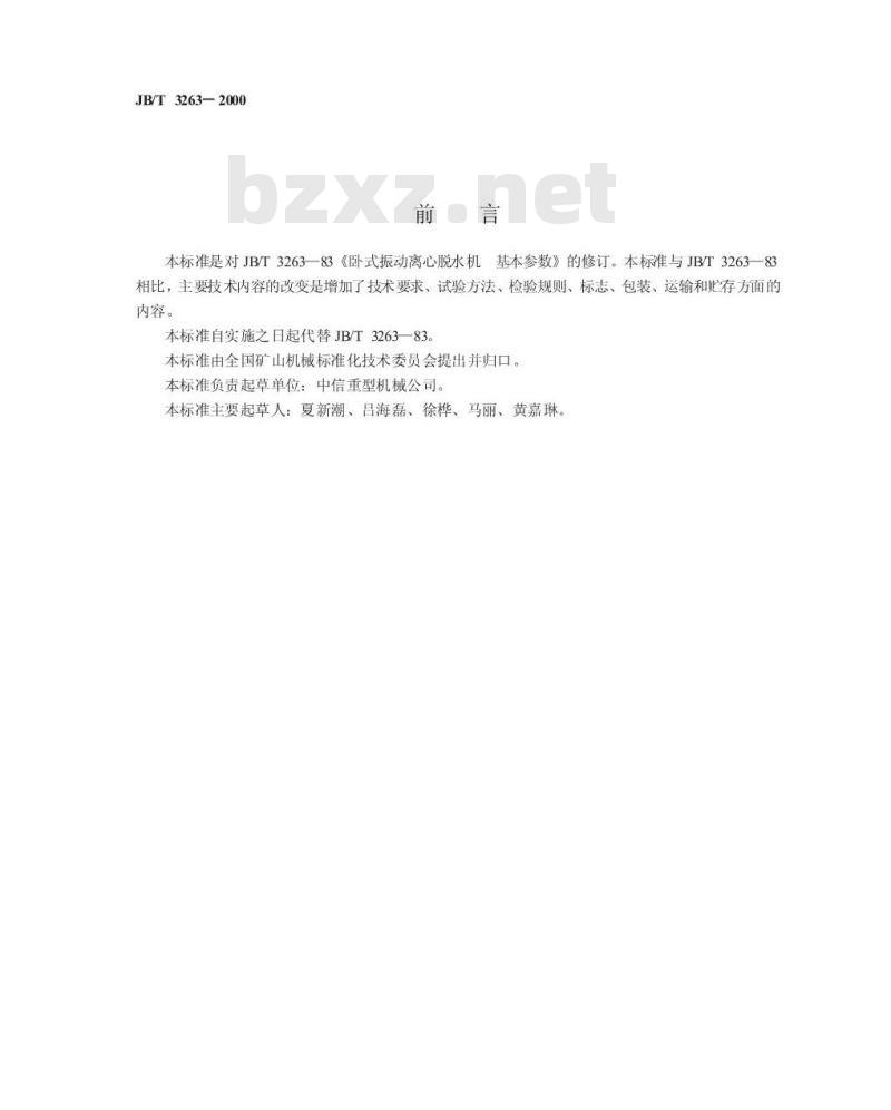 本标准是对JB/T3263一83《卧式振动离心脱水机基本参数》的修订。本标准与JB/T326383相比,主要技术内容的改变是增加了技术要求、试验方法、检验规则、标志、包装、运输和贮存方面的内容。