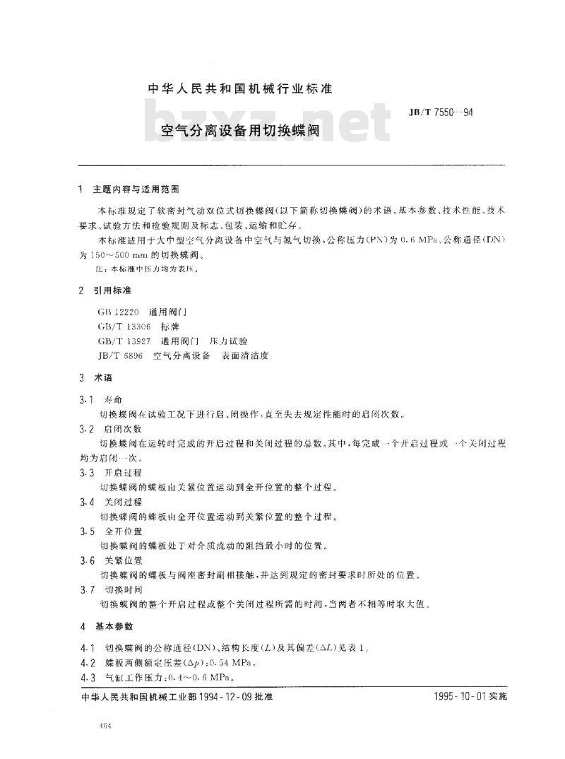 本标准规定了软密封气动双位式切换蝶阀的术语、基本参数、技术性能、技术要求、试验方法和检验规则及标志、包装、运输和贮存。 JB/T 7550-1994 空气分离设备用切换蝶阀 JB/T7550-1994