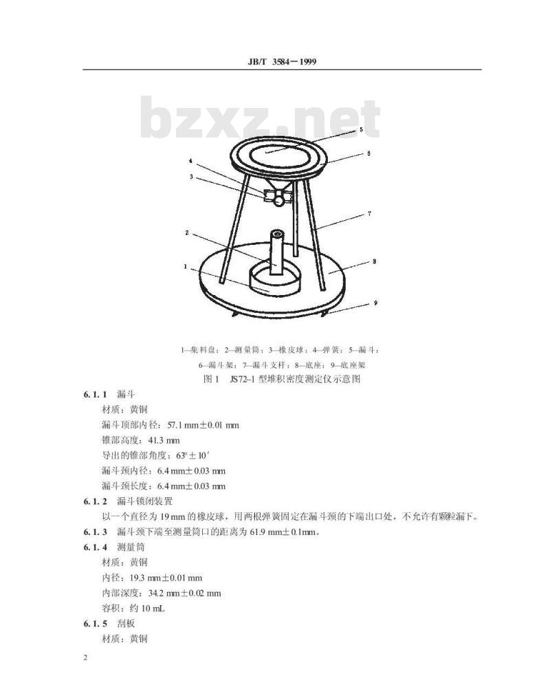 1-集料盘:2-测量筒:3橡皮球:4弹簧:5漏斗:6漏斗架:7漏斗支杆:8底座:9底座架图1JS72-1型堆积密度测定仪示意图漏斗顶部内径:57.1mm土0.01mm锥部高度:41.3mm