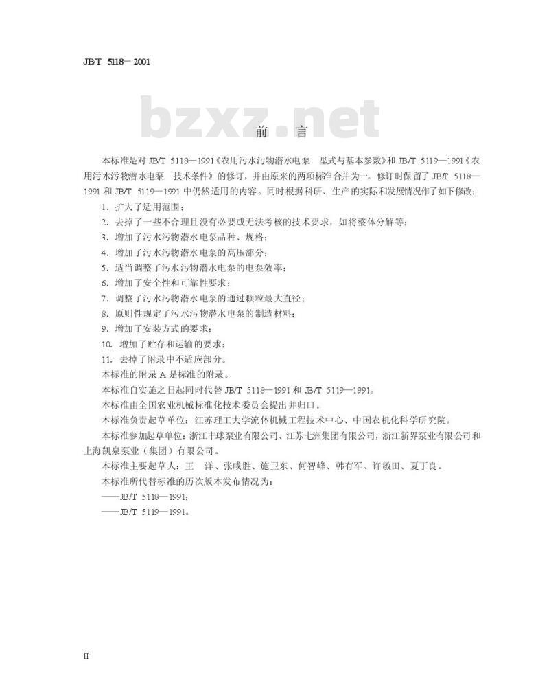 本标准自实施之日起同时代替JB/T51181991和JB/T5119—1991。本标准由全国农业机械标准化技术委员会提出并归口。本标准负责起草单位:江苏理工大学流体机械工程技术中心、中国农机化科学研究院。本标准参加起草单位:浙江丰球泵业有限公司、江苏七洲集团有限公司,浙江新界泵业有限公司和上海凯泉泵业(集团)有限公司。本标准主要起草人:王洋、张咸胜、施卫东、何智峰、韩有军、许敏田、夏丁良。本标准所代替标准的历次版本发布情况为:.B/T5118—1991;