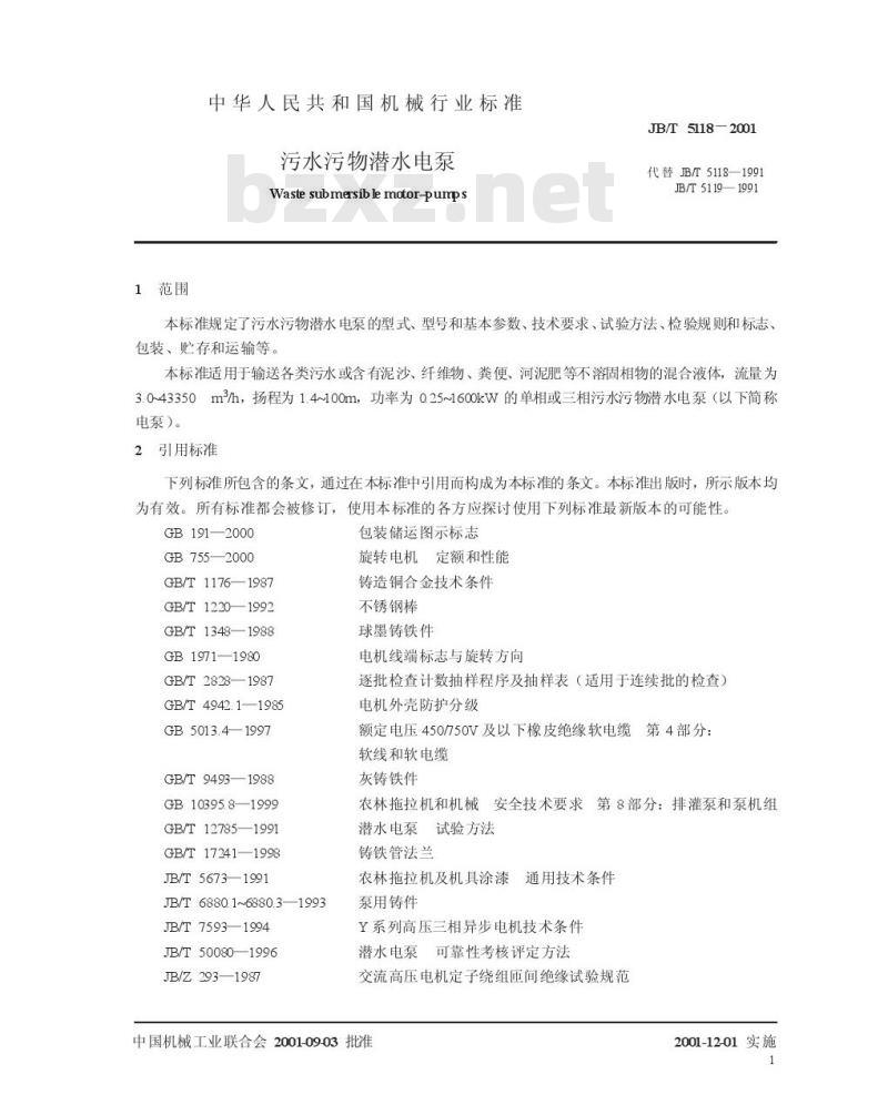 JB/T 5118—2001 本标准是对JB/T 5118—1991《农用污水污物潜水电泵 型式与基本参数》和JB/T 5119—1991《农用污水污物潜水电泵 技术条件》的修订与合并。修订时扩大了适用范围,调整了部分技术要求,增加安装方式等要求。 本标准规定了污水污物潜水电泵的型式、型号和基本参数,技术要求,试验方法,检验规则,标志、包装、运输和贮存等。 本标准适用于输送各类污水或含有泥沙、纤维物、粪便、河泥肥等不溶固相物的混合液体,流量为3.0m3/h~43350m3/h,扬程为1.4m~100m,功率为0.25kW~1600kW的单相或三相污水污物潜水电泵。 本标准于1991年以JB/T 5118—91、JB/T 5119—91首次发布,本次是第一次修订。 JB/T 5118-2001 污水污物潜水电泵 JB/T5118-2001