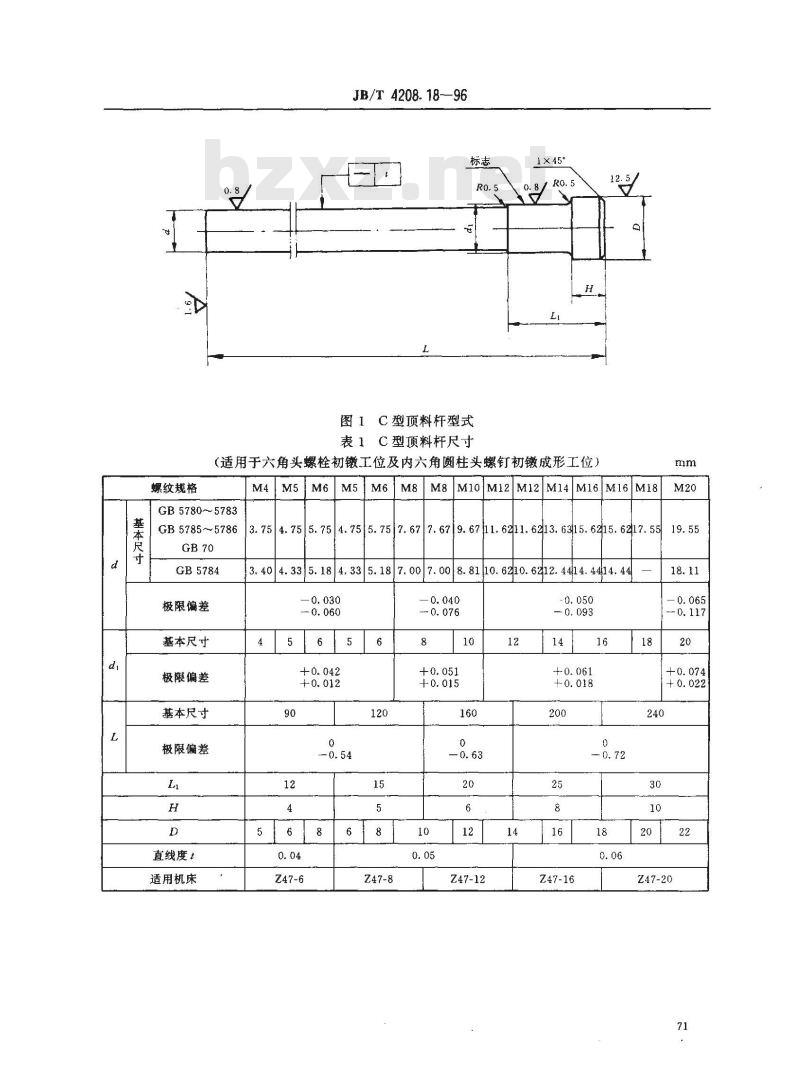 示例:M10GB5782六角头螺栓,适用于Z47-12机床初镦工位用C型顶料杆的标记为:顶料杆(初)GB5782M10Z47-12JB/T4208.18—9672