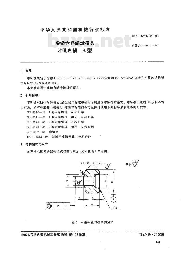 - JB/T 4210.22-1996 冷镦六角螺母模具 冲孔凹模 A型