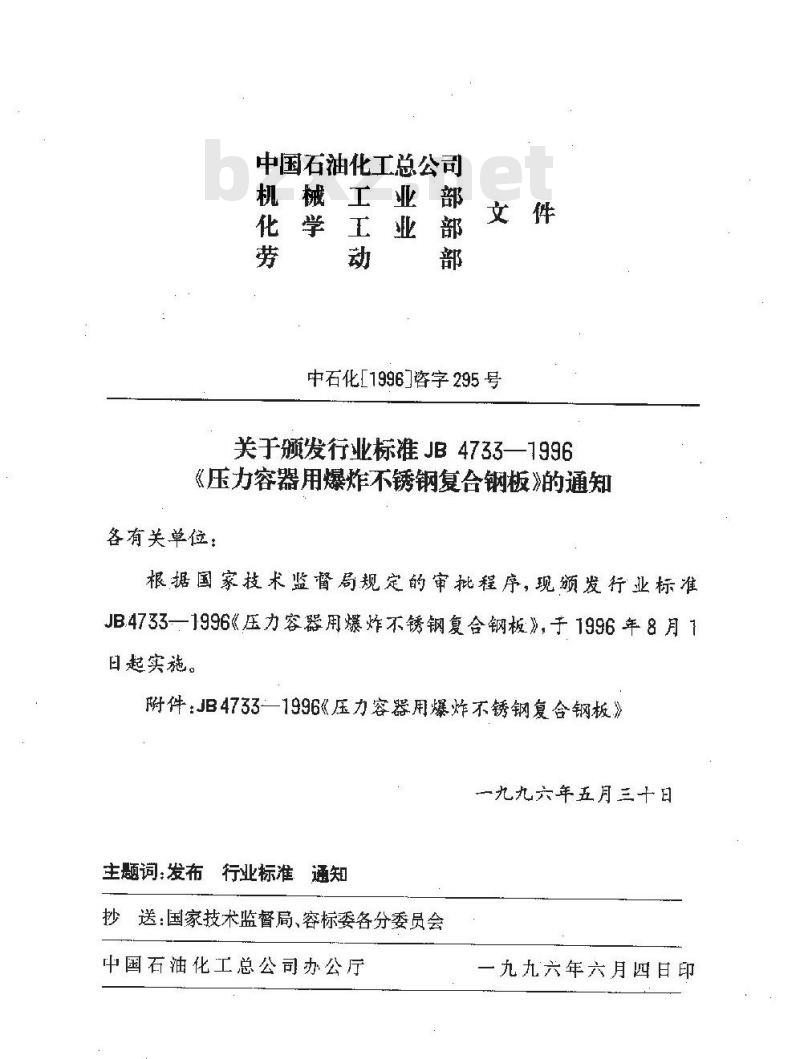 根据国家技术监督局规定的审批程序,现颁发行业标准JB.4733—一1996《压力容器用爆炸不锈钢复合钢板》,于1996年8月1日起实施。