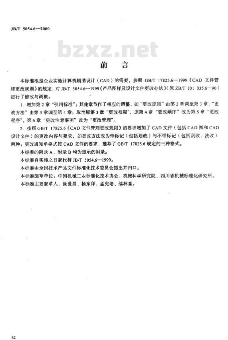1.增加第2章“引用标准”:其他章节作了相应的调整,如“更改原则”由第2章调至第3章,“更改方法”由第5章调至第4章;取消原第3章“更改权限”,原第4章“更改顺序”改为第5章“更改程序”,第6章“更改注意事项”改为“更改管理\。2.按照GB/T17825.6《CAD文件管理更改规则》的要求增加了CAD文件(包括CAD图和CAD设计文件)的更改内容与要求,如更改方法改为带标记(包括划改)与不带标记(包括刮改、洗改)两种;更改通知单格式按CAD文件的要求,推荐了GB/T17825.6规定的三种格式。本标准的附录A、附录B均为提示的附录。本标准自实施之日起代替JB/T5054.6—1999。本标准由全国技术产品文件标准化技术委员会提出并归口。本标准起草单位:中国机械工业标准化技术协会、机械科学研究院、四川省机械标准化研究所。本标准主要起草人:涂世昌、杨东拜、盖宪培、续林童。62
