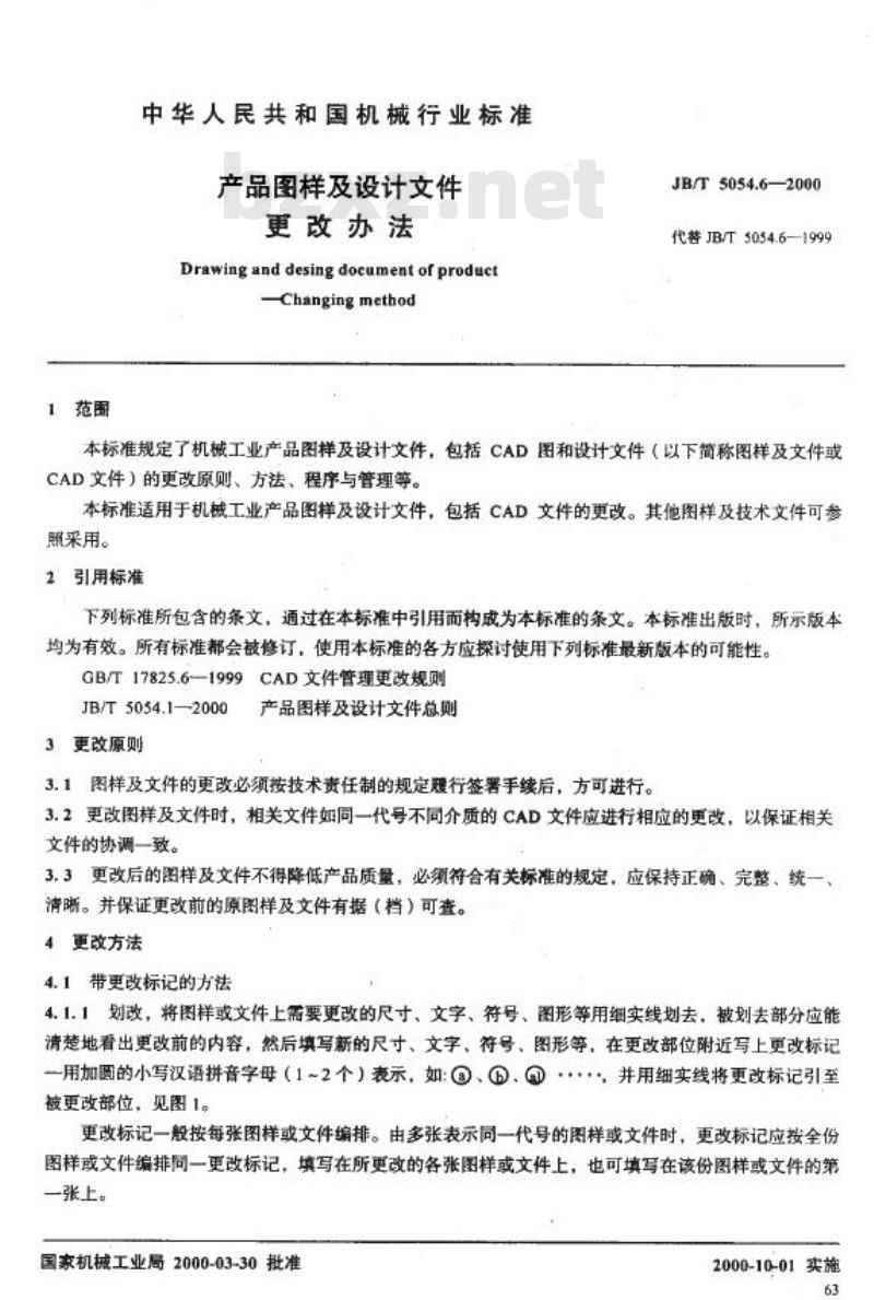 JB/T 5054.6-2000 本标准根据企业实施计算机辅助设计(CAD)的需要,参照GB/T17825.6-1999《CAD文件管理更改办法》的规定,对JB/T 5054.6-1999《产品图样及设计文件更改办法》进行了修改与调整。 本标准规定了机械工业产品图样及设计文件,包括CAD图和设计文件编号的更改原则、方法、程序与管理等。 本标准适用于机械工业产品图样及文件设计,包括CAD文件的更改。其他图样及技术文件可参照采用。 本标准于1990年以ZB/T J01 035.6-90首次发布,1999年4月标准编号调整为JB/T 5054.6-1999。 JB/T 5054.6-2000 产品图样设计文件 更改办法 JB/T5054.6-2000