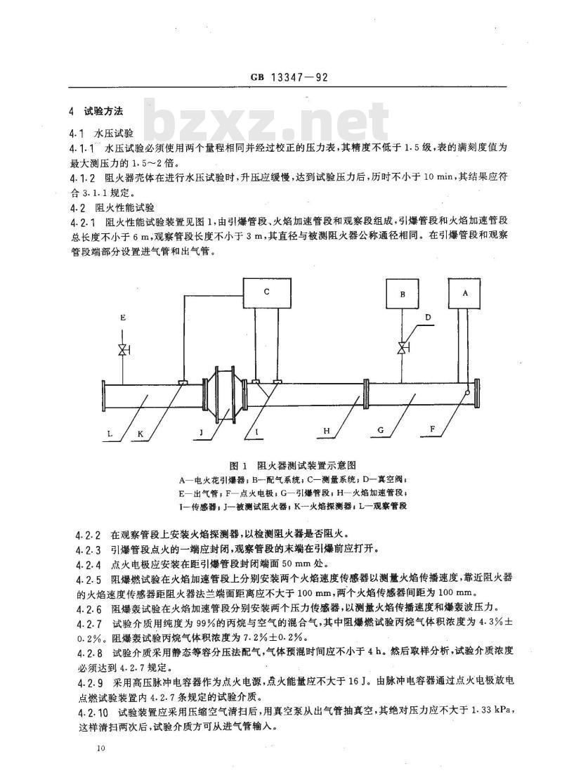 4.2.11试验在常压下进行,从观察管段上火焰探测器的信号来判断阻火器是否阻止火焰传播。4.2.12试验装置内火焰传播速度应由4.2.5、4.2.6条规定的火焰速度传感器或压力传感器和相应的仪器测出。