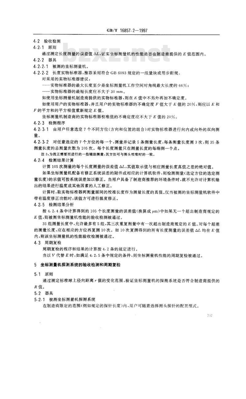 周期复检的程序和结果的计算按4.2条的规定进行。当以V代替E时,如满足4.2.5条中规定的条件,则坐标测量机性能的周期复检被通过。5坐标测量机探测系统的验收检测和周期复检5.1原则