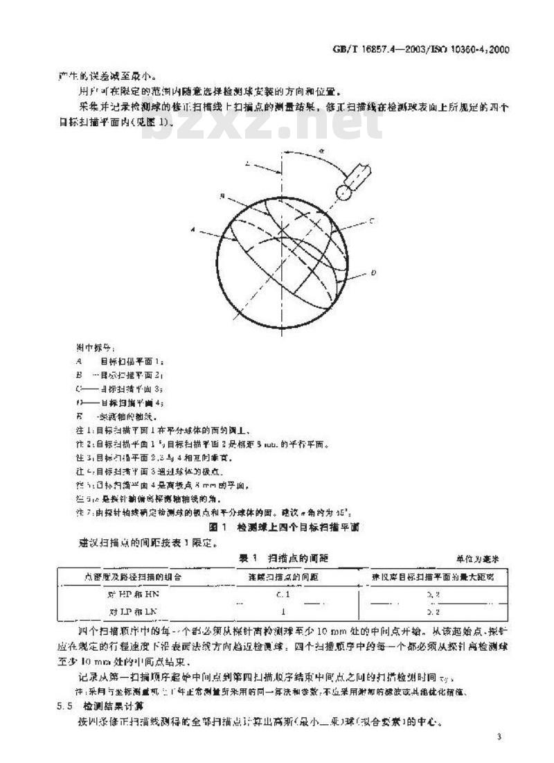 GB/T 16857.4—2003/ISO 10360-4.2000用户可在限定的范洲内随意选择检测球安获的方向和位置,采朱并记录检测球的烤证扫描线上扫描点的洲量站果,修工担播线在检测球表面上所见定的刃十自标扫描平面内(览医1),