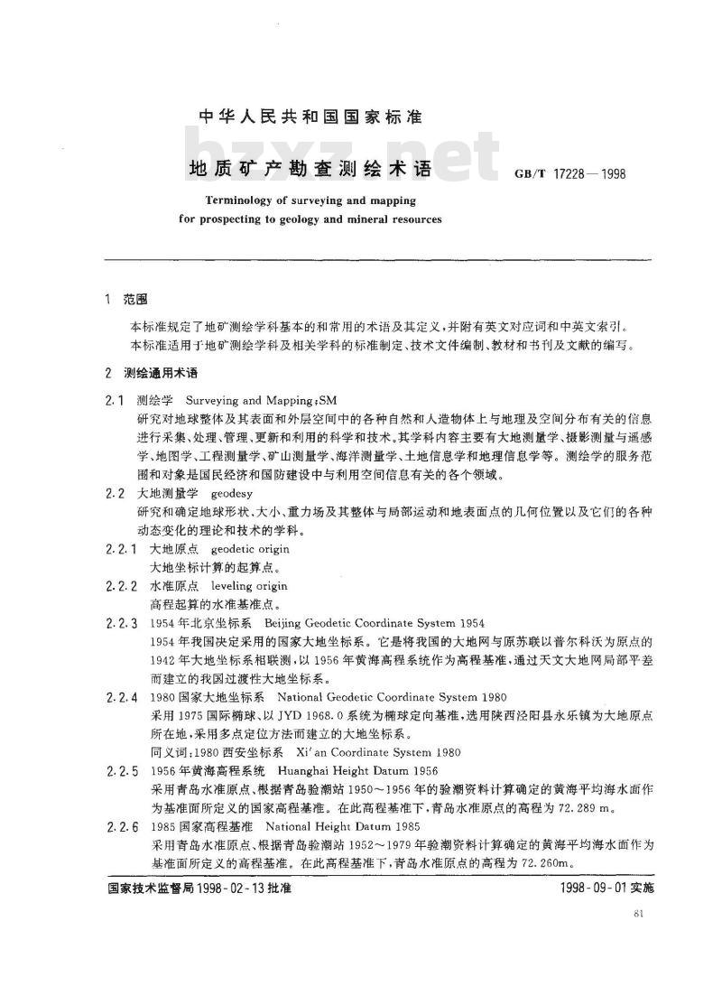 Terminology of surveying and mappingfor prospecting to geology and mineral resourcesGB/T 17228—1998