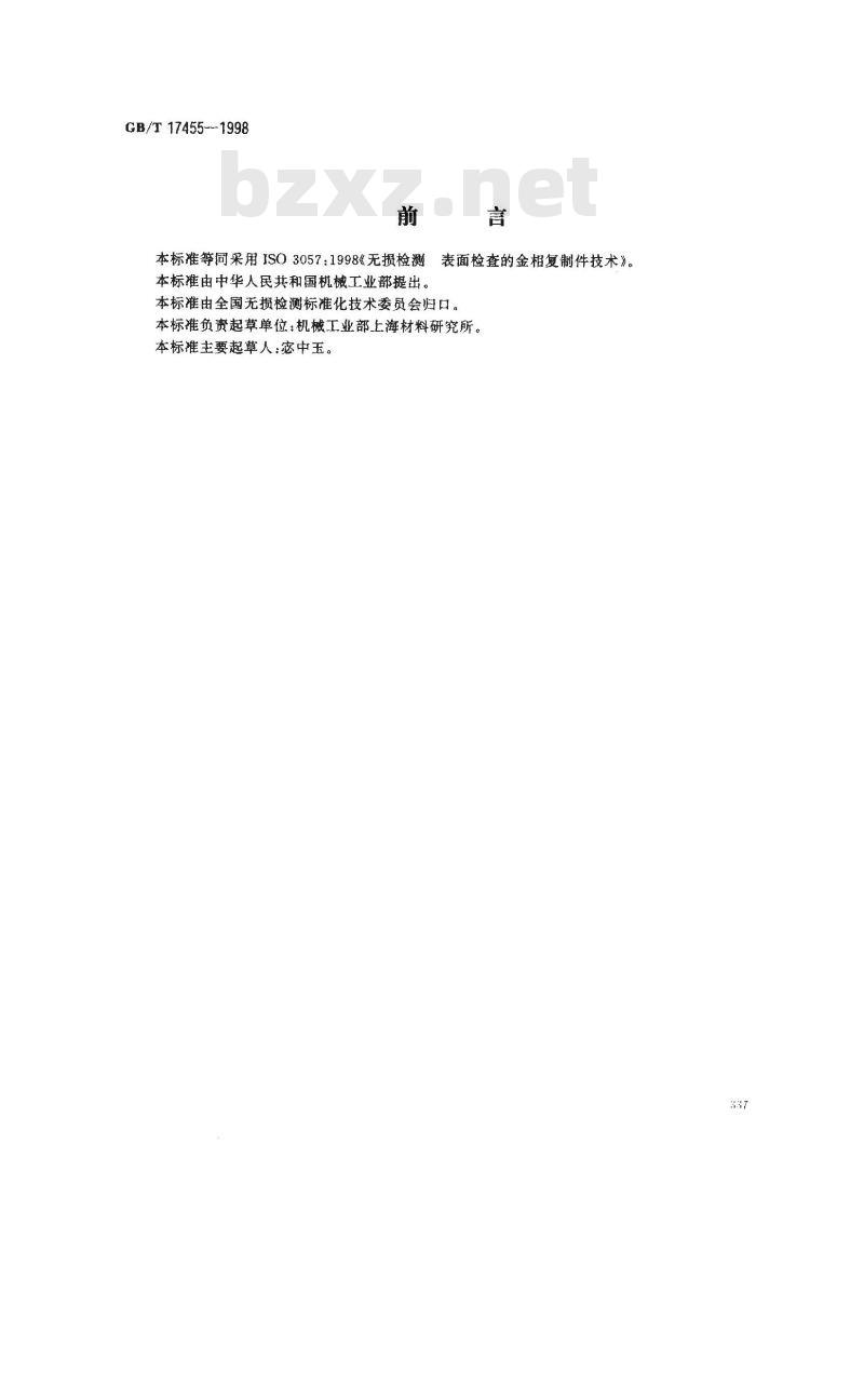 本标准等同采用ISO3057:1998《无损检测表面检查的金相复制件技术》。本标准由中华人民共和国机械工业部提出。本标准由全国无损检测标准化技术委员会归口。本标准负贵起草单位:机械工业部上海材料研究所。本标准主要起草人:宓中玉。