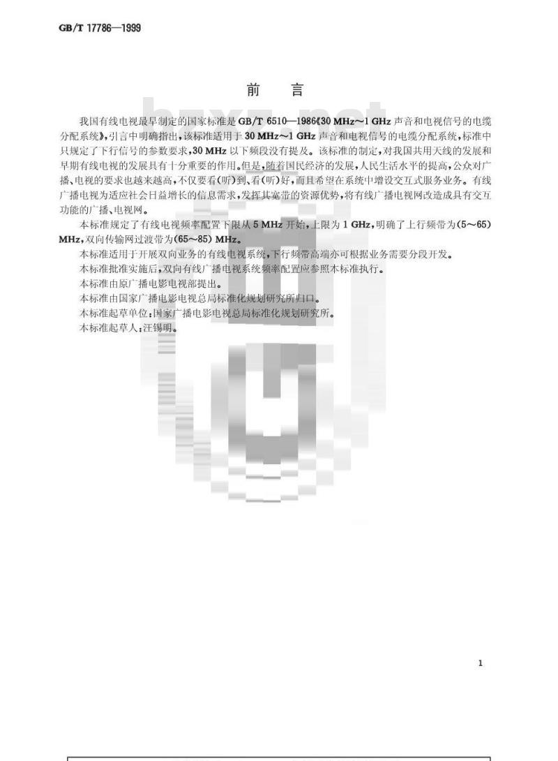 本标准规定了双向有线广播电视系统5MHz~1GHz的频率配置。GB/T17786—1999
