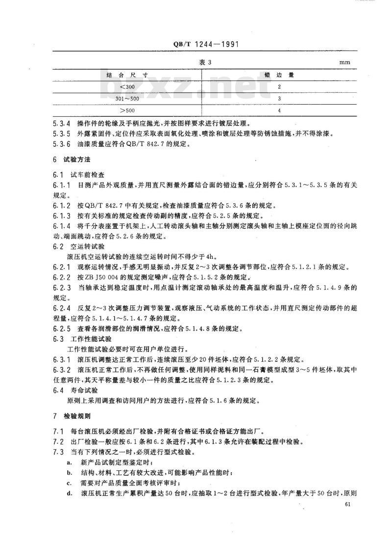 5.3.1滚压机外观表面上不应有图样规定以外的凸凹不平、粗糙不平和其他损伤缺陷。5.3.2防护罩壳和箱门、盖板等应平整,与机体的接合牢靠、无跷曲和摇悬现象。5.3.3滚压机零件外露结合面的错边量不得超过表3的规定。60