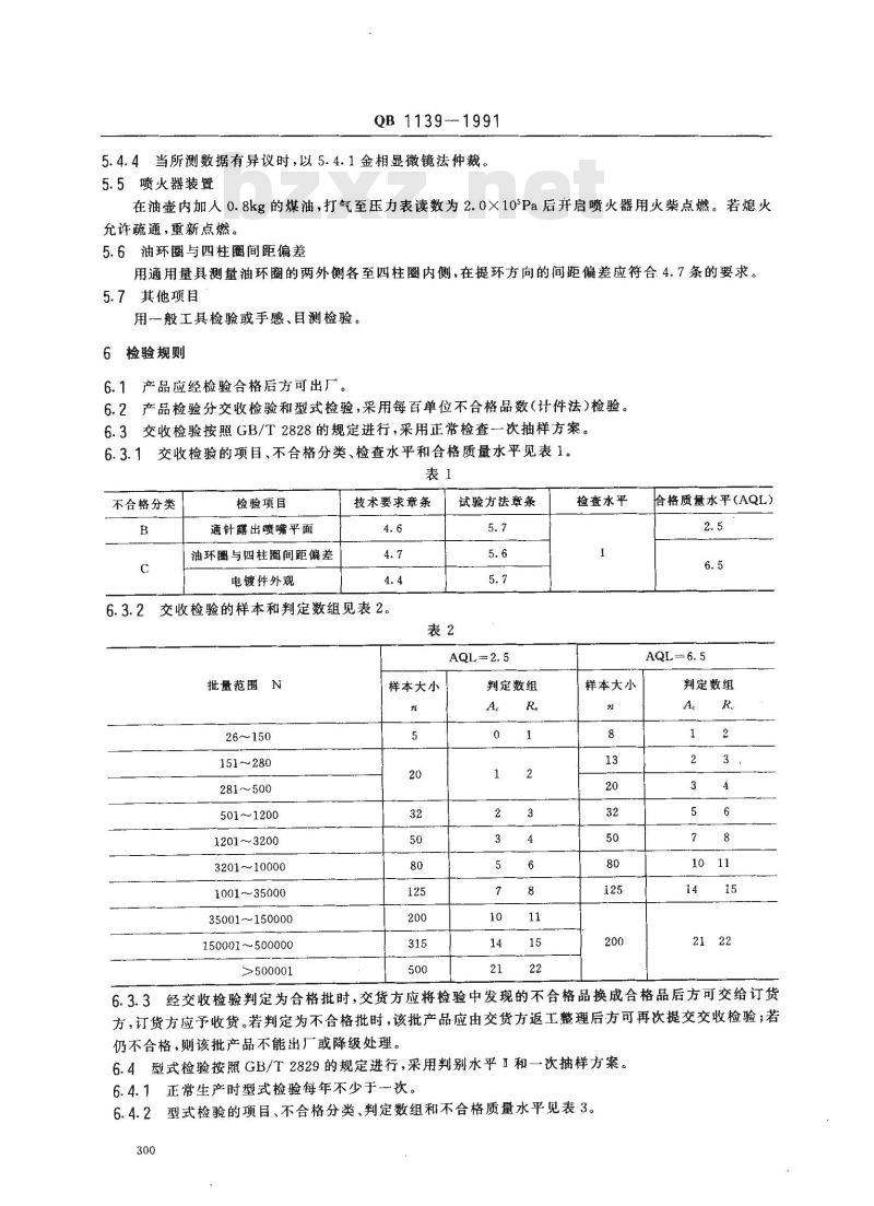 6.3.3经交收检验判定为合格批时,交货方应将检验中发现的不合格品换成合格品后方可交给订货方,订货方应予收货。若判定为不合格批时,该批产品应由交货方返工整理后方可再次提交交收检验;若仍不合格,则该批产品不能出厂或降级处理。6.4型式检验按照GB/T2829的规定进行,采用判别水平1和一次抽样方案。6.4.1正常生产时型式检验每年不少于一次。6.4.2型式检验的项目、不合格分类、判定数组和不合格质量水平见表3。300