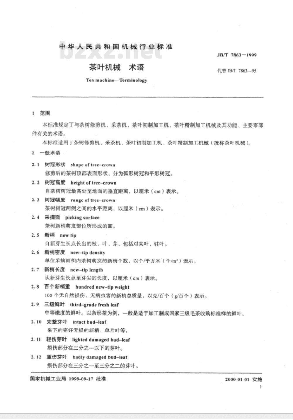 JB/T 7863-1999 本标准是对 JB/T 7863-95《茶叶机械 名词术语》的修订。修订时仅按有关规定作了编辑性修改,主要技术内容没有改变。 本标准规定了与茶叶树修剪机、采茶机、茶叶初制加工机、茶叶精制加工机械作其功能、主要零部件有关的术语。 本标准适用于茶叶修剪机、采茶机、茶叶初制加工机、茶叶精制加工机械。 本标准于 1987 年 7 月 23 日以 GB 8057-87 首次发布,于 1996 年 4 月调整为 JB/T 7863-95。 JB/T 7863-1999 茶叶机械 术语 JB/T7863-1999