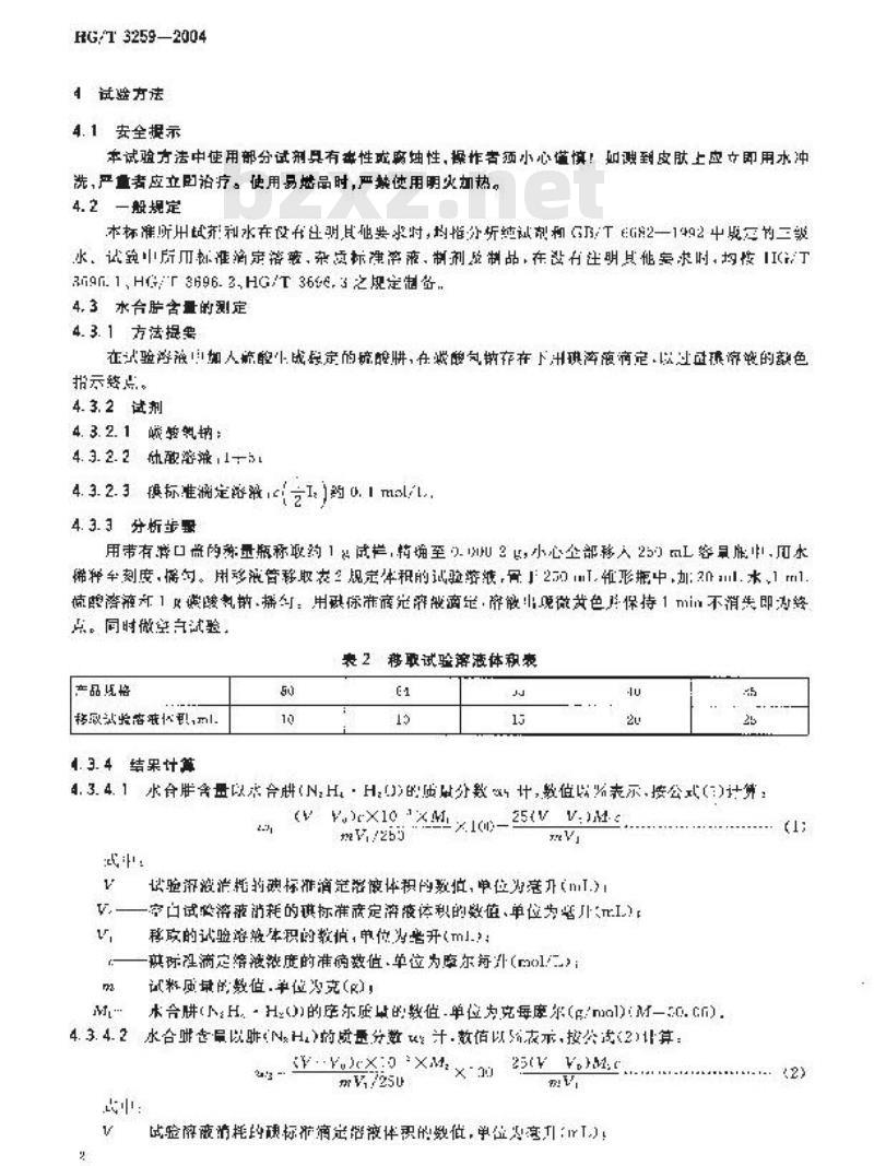 本标准规定了工业水合脱的要求、试验方法、检验规则以及标志、标签、包装、运输和贮存。本标准适用于工业水合腆。该产品主要用于制药和作为化学工业原料、还原剂和除氧剂。分子式:NZH;·H20相对分子质量:50.O6(按2001 年国际相对原子质量) HG/T 3259-2004 工业水合肼 HG/T3259-2004