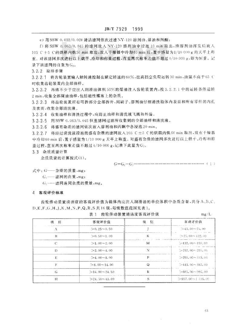 齿轮传动装置清洁度的客观评价值为箱体内应注人润滑油的单位体积中杂质含量.共分A、3、C、D、E、F、G、H、J、K、M、N、P、Q、R、S共16级,每级数值范围见表1。表1齿轮传动装置清洁度客观评价值级别