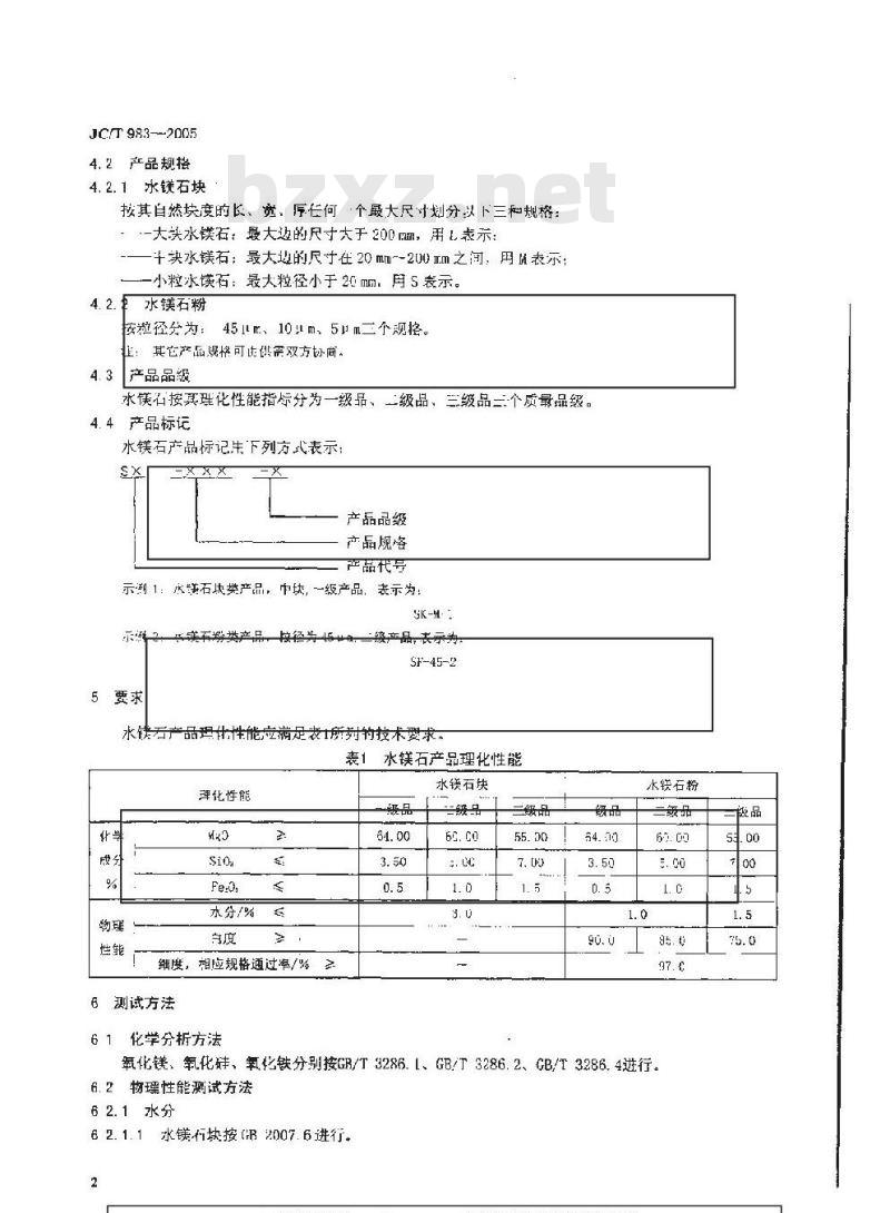本标准规定了水镁石矿产品的术语和定义、产品分类和标记、要求、试验方法、检验规则、标志、包装、运输及贮存的一般要求。本标准适用于水镁石矿产品的质量检验和质量验收。本标准不适用于纤维状水镁石。 JC/T 983-2005 水镁石 JC/T983-2005