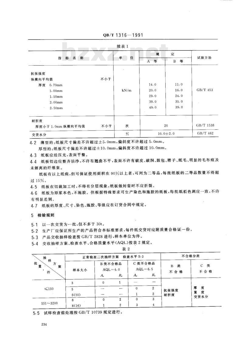 4.5纸板在切裁加工时,不得有分层现象,纸板做封套时不应折裂。4.6纸板为原浆本色,不施胶。但根据特殊要求可生产染色和施胶的纸板,每批纸板色调应一致,不许有明显差别。