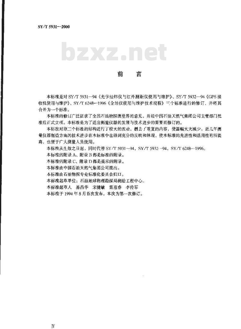 本标准的修订广泛征求了全国石汕物探测量界的意见,并经中国石天然气集团公司主管部门批准后正式立项。本标准是为了适应测量仪器的发展与技术进步的需要而修订的。本标准对原三个标准的结构进行了较大的改动,删右「重复的内容,使篇幅大大减少。近几年测量仪器制造方面的技术进步在本标准中也得到充分的反映和休现,使本标准的先进性和适用性有所提高,也便于广大测量人员使用。本标准从生效之日起,同时代替SY/T5931--94,SY/T5932--94,SY/T6248--1996,本标准的附录A、附录R都是标准的附录。本标准的附录C、附录D都是提示的附录。本标准由中国石油天然气集团公司提出。本标准由石油物探专业标准化委员会归口。本标准起草单位:石汕地球物理勘探局测绘工程中心本标起草人易昌华宋键敏雷迎春李传军本标准于1994年8月首次发布,本次为第一次修订。V