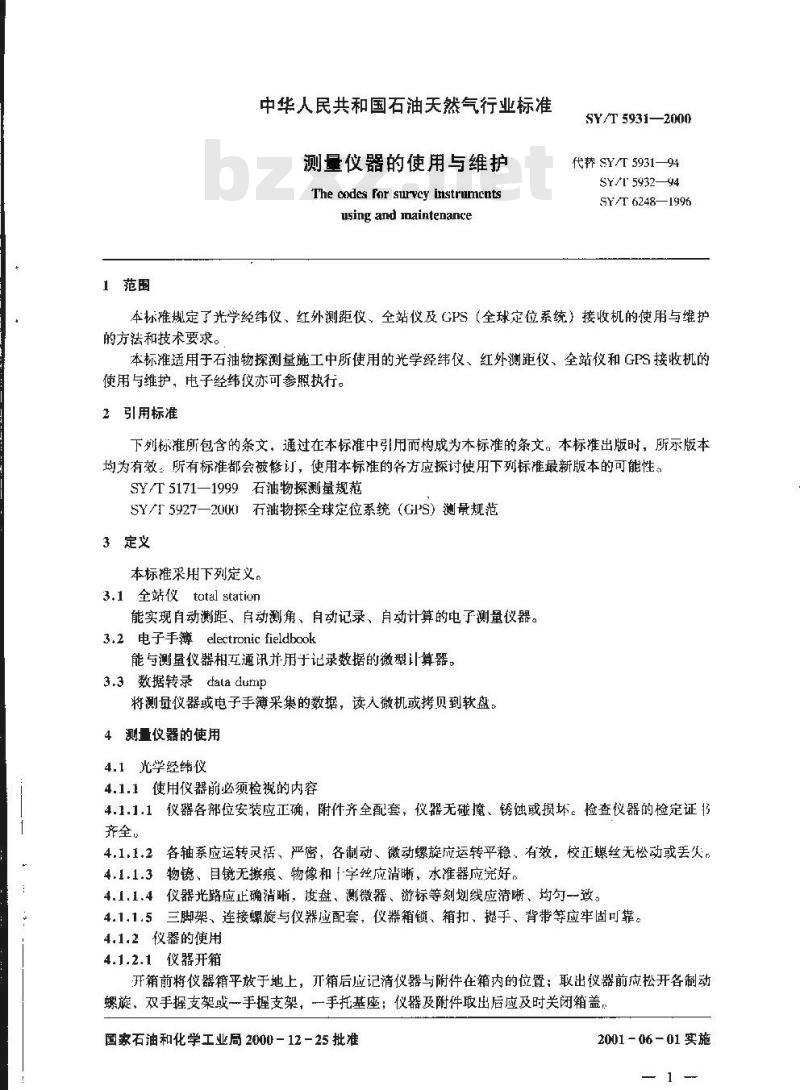 本标准适用于石油物探测量施工中所使用的光学经纬仪、红外测距仪。全站仪和GPS接收机的使用与维护,电子经纬仪亦可参照执行。2引用标准