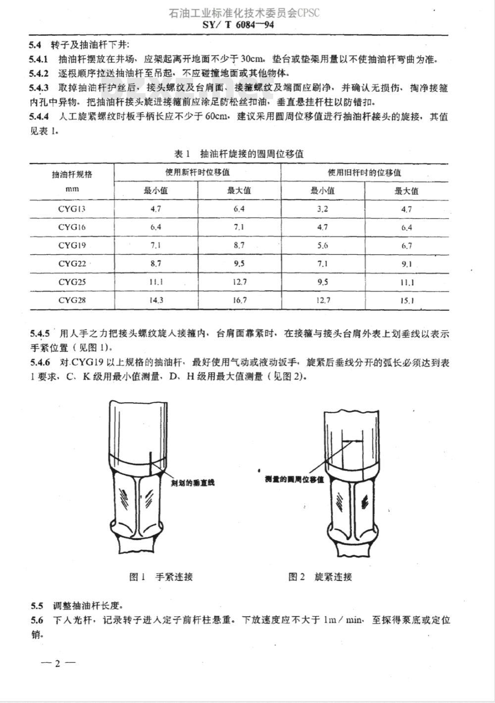 5.4.1抽油杆摆放在井场,应架起离开地面不少于30cm。垫台或垫架用量以不使抽油杆弯曲为准。5.4.2逐根顺序拉送抽油杆至吊起,不应碰撞地面或其他物体。5.4.3取掉抽油杆护丝后,接头螺纹及台肩面、接箍螺纹及端面应刷净,并确认无损伤,掏净接箍内孔中异物。把抽油杆接头旋进接箍前应涂足防松丝扣油,垂直悬挂杆柱以防错扣。5.4.4人工旋紧螺纹时板手柄长应不少于60cm,建议采用圆周位移值进行抽油杆接头的旋接,其值见表1。