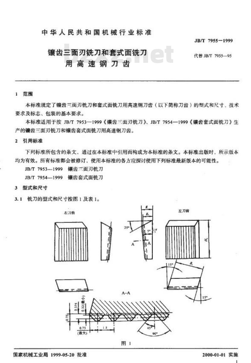 本标准规定了镶齿三面刃铣刀和套式面铣刀用高速钢刀齿(以下简称刀齿)的型式和尺寸、技术要求及标志、包装的基本要求。本标准适用于按JB/T79531999《镶齿三面刃铣刀》、JB/T7954—1999《镶齿套式面铣刀》生产的镶齿三面刃铣刀和镶齿套式面铣刀用高速钢刀齿。2引用标准