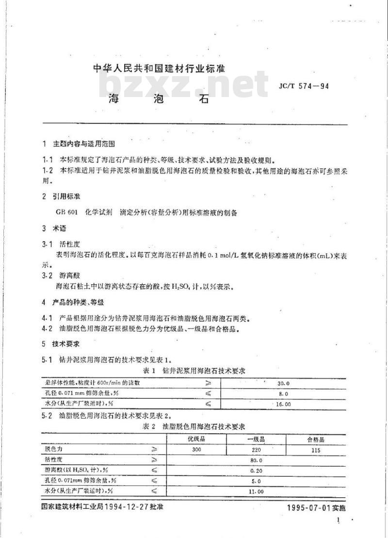 1.1本标准规定了海泡石产品的种类、等级、技术要求、试验方法及验收规则。JC/T574-94