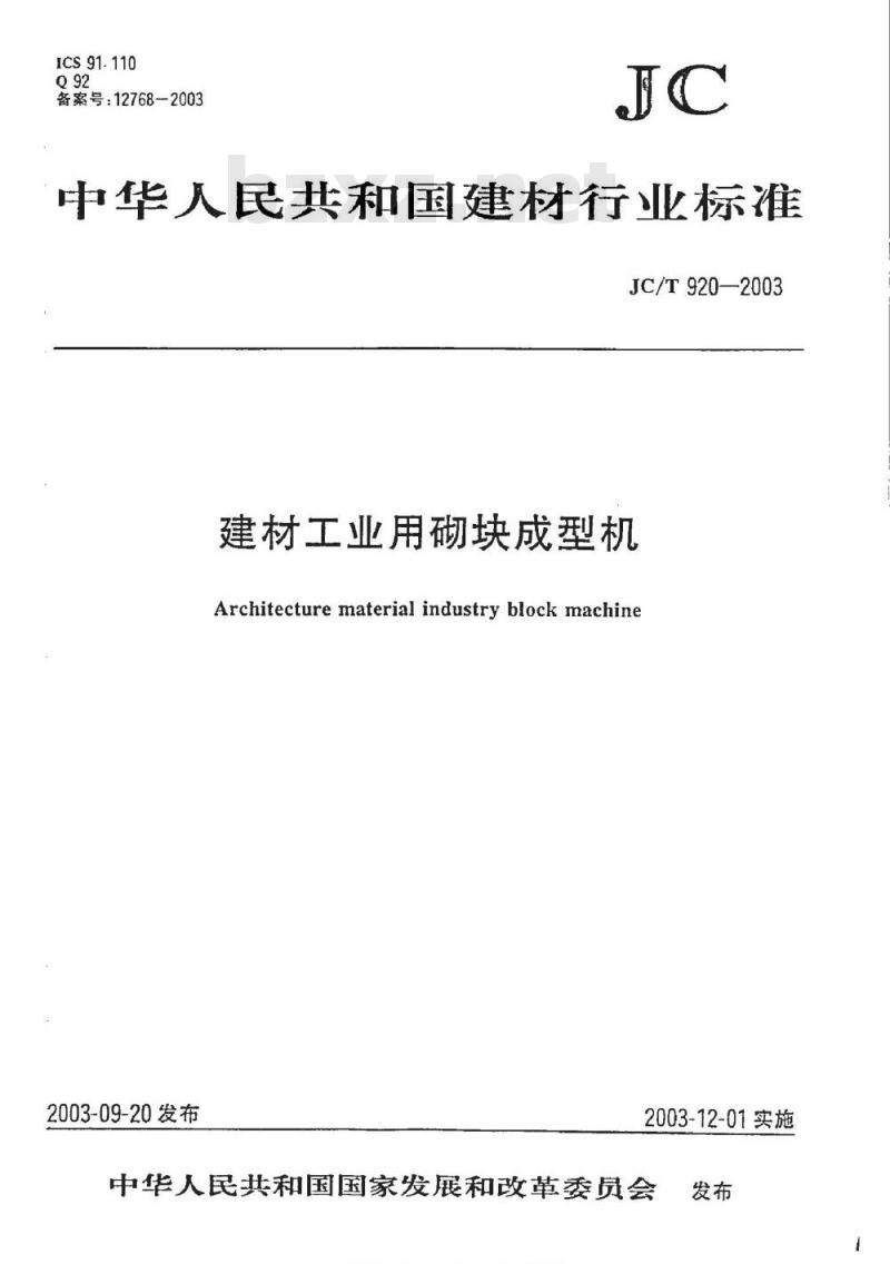 5.1.1块成型机应符合本标准的规定,并按规定程序的图样和技术文件制造。JC/T920—2003