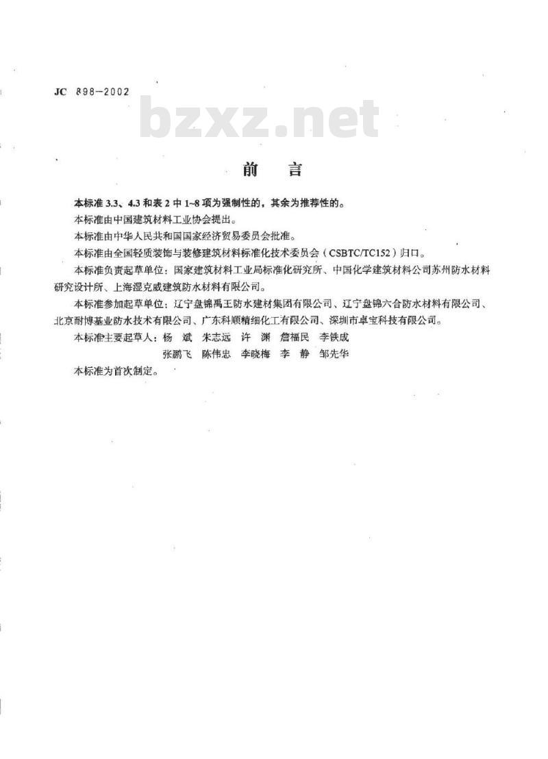 本标准3.3、4.3和表2中1~8项为强制性的,其余为推荐性的。本标准由中国建筑材料工业协会提出。本标准由中华入民共和国国家经济贸易委员会批准。本标准由全国轻质装饰与装修建筑材料标准化技术委员会(CSBTC/TC152)归口。本标准负责起草单位:国家建筑材料工业局标准化研究所、中国化学建筑材料公司苏州防水材料研究设计所、上海湿克威建筑防水材料有限公司。本标准参加起草单位:辽宁盘锦禹王防水建材集团有限公司、辽宁盘锦六合防水材料有限公司北京耐博基业防水技术有限公司、广东科顺精细化工有限公司、深圳市卓宝科技有限公司。本标准主要起草人:杨斌朱志远许渊詹福民李铁成张鹏飞陈伟忠李晓梅李静邹先华本标准为首次制定。
