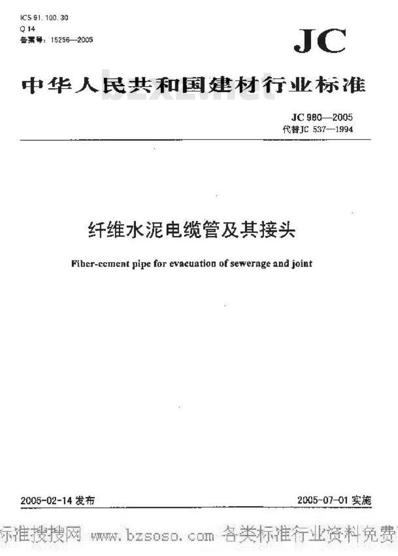 本标准规定了纤维水泥电缆管及其接头的术语和定义、分类、形状与规格、标记、原材料、要求、试验方法、检验规则、标志与合格证、运输与保管等。本标准适用于以无机矿物纤维、有机合成纤维或植物纤维为增强材料生产的电力、通讯及其它领域保护电线或电缆用的纤维水泥电缆管(以下简称电缆管)及其接头。 JC 980-2005 纤维水泥电缆管及其接头 JC980-2005