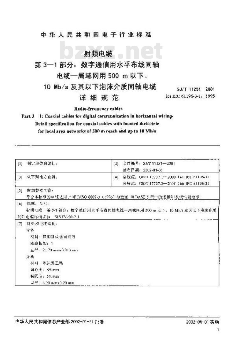 SJ/T 11251-2001 射频电缆 第3-1部分:数字通信用水平布线同轴电缆-局域网用500m以下、10Mb/s及其以下泡沫介质同轴电缆详细规范 SJ/T11251-2001