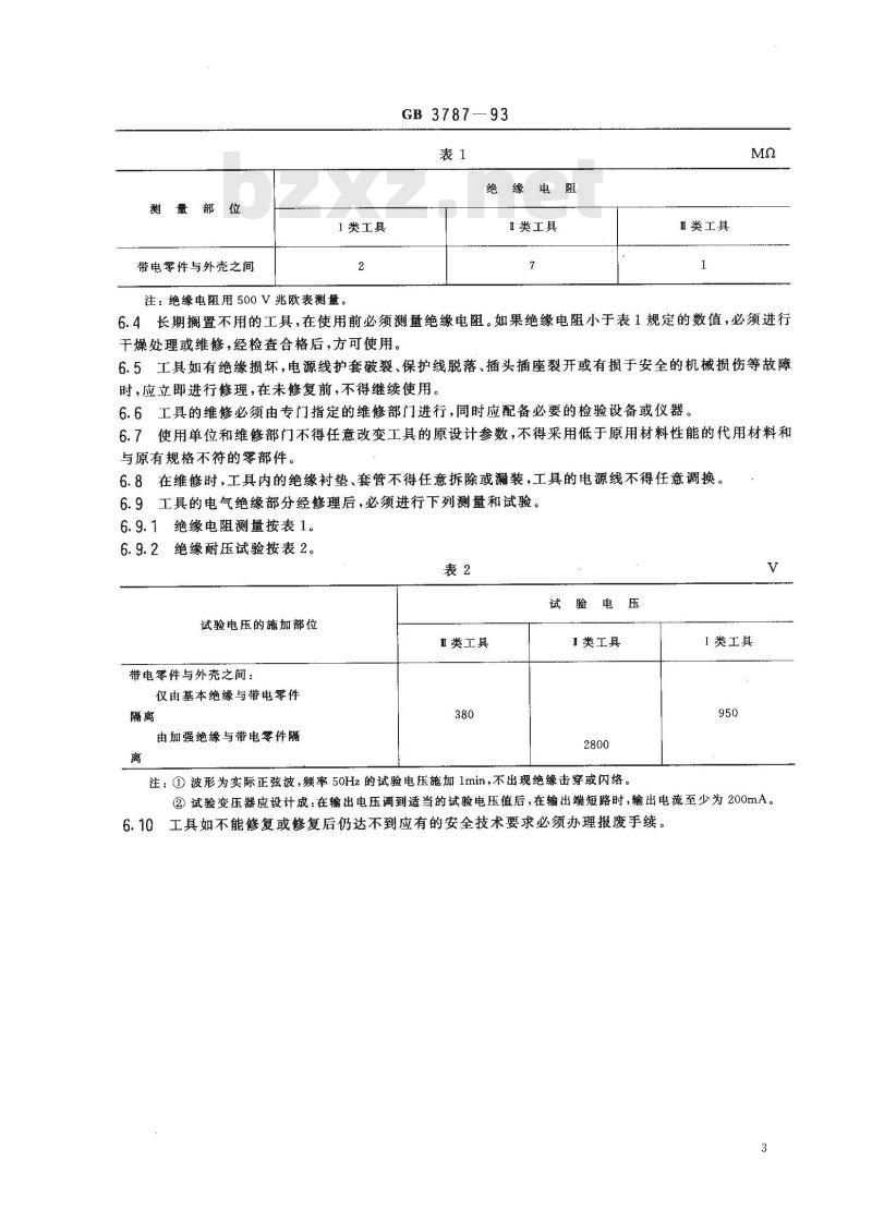 6.8在维修时,工具内的绝缘衬垫、套管不得任意拆除或装,工具的电源线不得任意调换。6.9工具的电气绝缘部分经修理后,必须进行下列测量和试验。6.9.1绝缘电阻测量按表1。