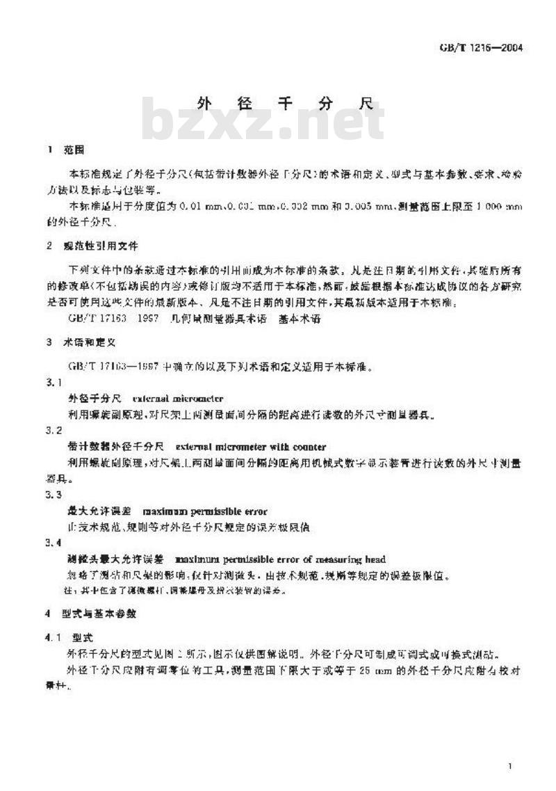 本标准规定了外径千分尺(包括带计数器外径千分尺)的术语和定义、型式与基本参数、要求、检验方法以及标志与包装等。本标准适用于分度值为0.01mm,0.001mm,0.002mm和0.005mm,测量范围上限至l000mm的外径千分尺。 GB/T 1216-2004 外径千分尺 GB/T1216-2004