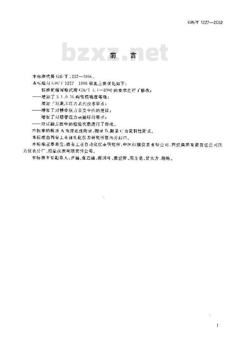 本弥难(H/112271986相比要变化如下:标炭的编写格双按【1一2000的要求在行「够总:增血了3.1、0.16阅级精确度等短:增加(对高非爪力表的较术要求1增加了对精压力志案全件的建议;增加了划精牵压力表仙样的要,对试验为法中的检验次数进行了修改,大标准的例录A为现范性附录,附求B、谢录为资制性陷录,本标准由西安工业自影化仪表研究所提出开归。(GI/T1227—2G02