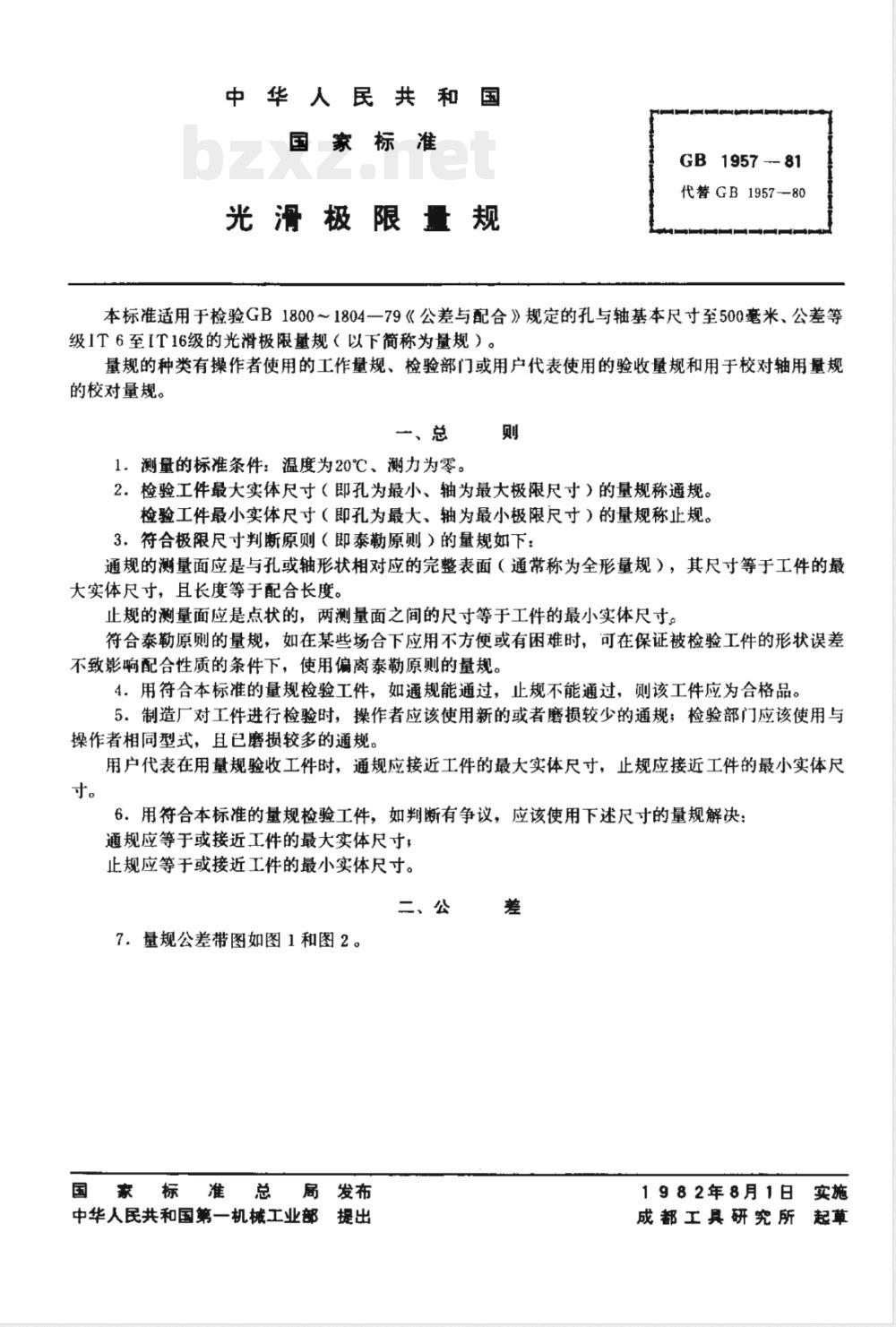 本标准适用于检验GB 1800~1804—79《公差与配合》规定的孔与轴基本尺寸至500毫米、公差等级IT6至IT16级的光滑极限量规。 GB 1957-1981 光滑极限量规 GB1957-1981