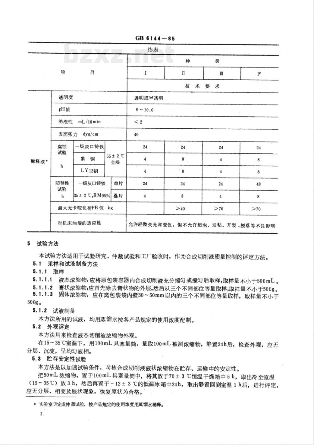 允许轻微失光和变色,但不允许起泡、发粘、开裂、脱落等不良影响本试验方法适用于试验研究、仲裁试验和工厂验收时,作为合成切削液质量控制的评定方法。5.1采样和试液制备方法