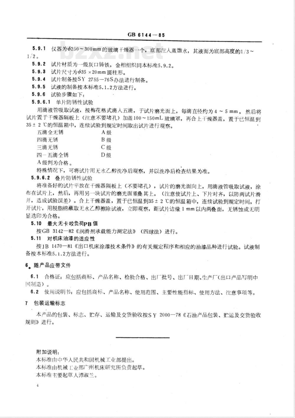 5.8.2试片材质:一级灰口铸铁,金相组织要求石墨A型2~4级,珠光体为98%以上,允许有少量磷共晶,不得有明显铸造缺陷。5.8.32试片尺寸:25×50×3mm或50×50×3mm。5.8.4试片制备:按SY2755一76S《防锈油脂防锈试验试片制备方法》进行制造。5.8.5试液制备:按本标准5.1.2方法进行。5.8.6试验步骤:将制备的试片,全浸于已配制好的试液中(不同材料的试片,不得浸人同一杯中),加盖玻璃罩,移置到已恒温到55±2℃的恒温器内,连续试验到规定时间,然后,取出试片,进行检查: