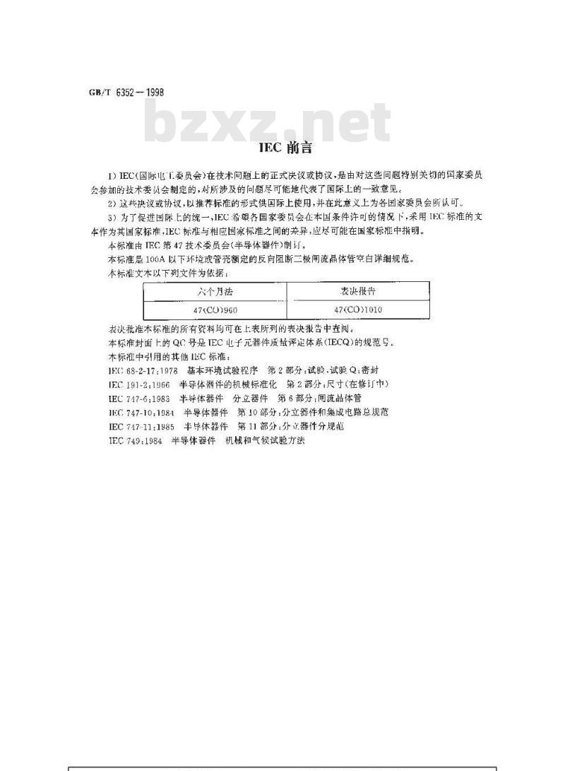 除非另有规定,本规范第8章中引用的条号对应于(GB/T4589.1--1989%半导体器件分立器件和集成地路总规范》(IEC747-10:1984)的条号,测试方法引自GB/T15291~-1994半导体分让器件和集成电路第6部分:闸流品体管》(IFC747-6:1983):试验片法1自GB/T4937-1995《半导体器件机械和气候试验方法([EC749:1.984)。本规范山中华人民共和国电了工业部提出。本规范由全国平导体器件标准化技术委员会归门1。本规范由电子工业部标滩化研充所负责起草,木规范主要起草人;于志贤、杨志片、顾康麟。..comGB/T 6352 --1998