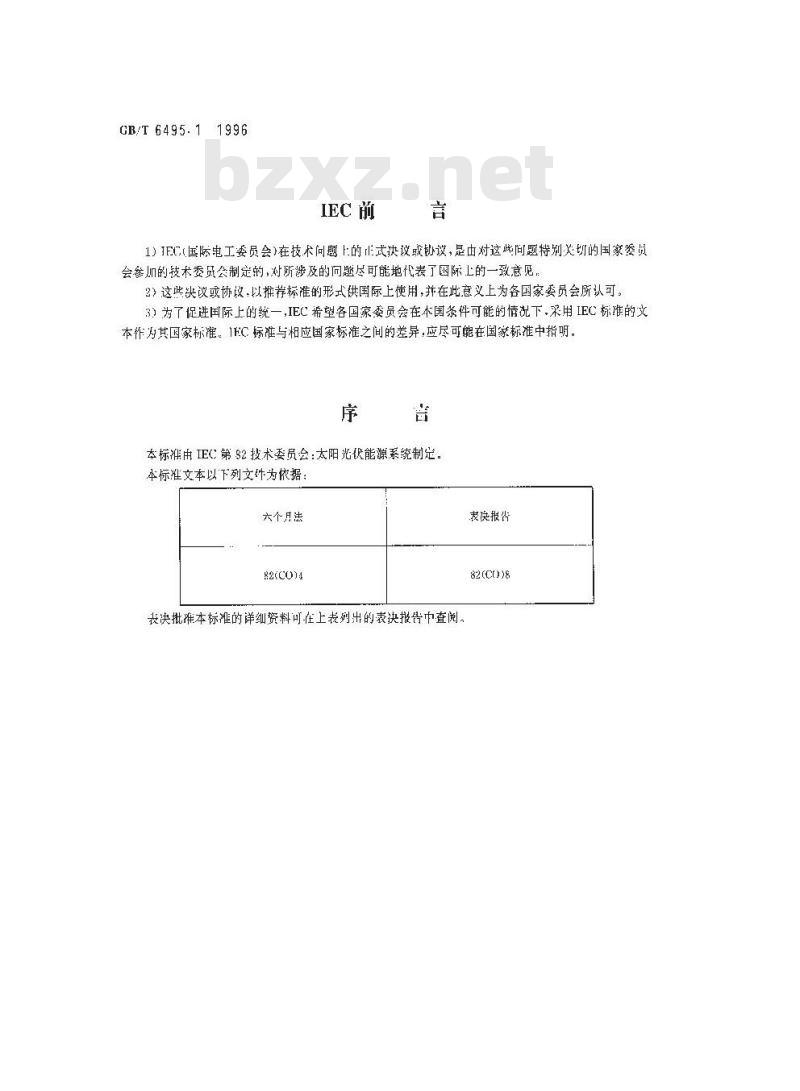 本标准等同采用1EC904-1:T987%光伏器件第1部分:光伏电流-电压特性的测量》。国际电委员会第82技术委员会:太阳光伏能源系统,于1987年至1989年间,先后发布了“光伏器件\方而的四项国际标准。除本标准外,还有;IEC904-2:19898光伏器件第2部分:标准太附电池的要求”IEC914-3:1989&光伏器件第3部分:地面用光伏器件的测量原理及标准光谱辐照度数据3IFC891:1987品体硅光伏器件的1-V实测特性的温度和辐照度修正方法》这川项国际标准的士要内容在原国家标准GB649386《地面用标准太阳电池》利6495-86地面用太附电池电性能测试方法中己不同程度地包含。为了尽快适应国际贸易、技术利经济交流的需要,等同果用这叫项国际标准.转化为我国标准是完全有基础的,也是适时的。本标准从实施之日起,同时代替GB6493—86和GB6495—86。本际准由中华人民共和国电了「业部提出。本标准全国太阳光伏能源系统标准化技术委员会归口。本新准记草单位:西安交通大学。本标准主要起草人·黄嘉像等。GB/T6495.11996