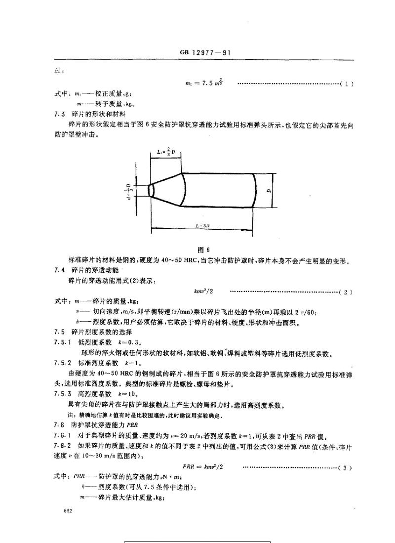 由硬度为4050HIRC的钢制成的碎片,相当于图6所示的安全防护罩抗穿透能力试验用标准弹头,选用标推烈度系数。典型的标准碎片是螺栓、螺母和垫片。7.5.3高烈度系数k10。