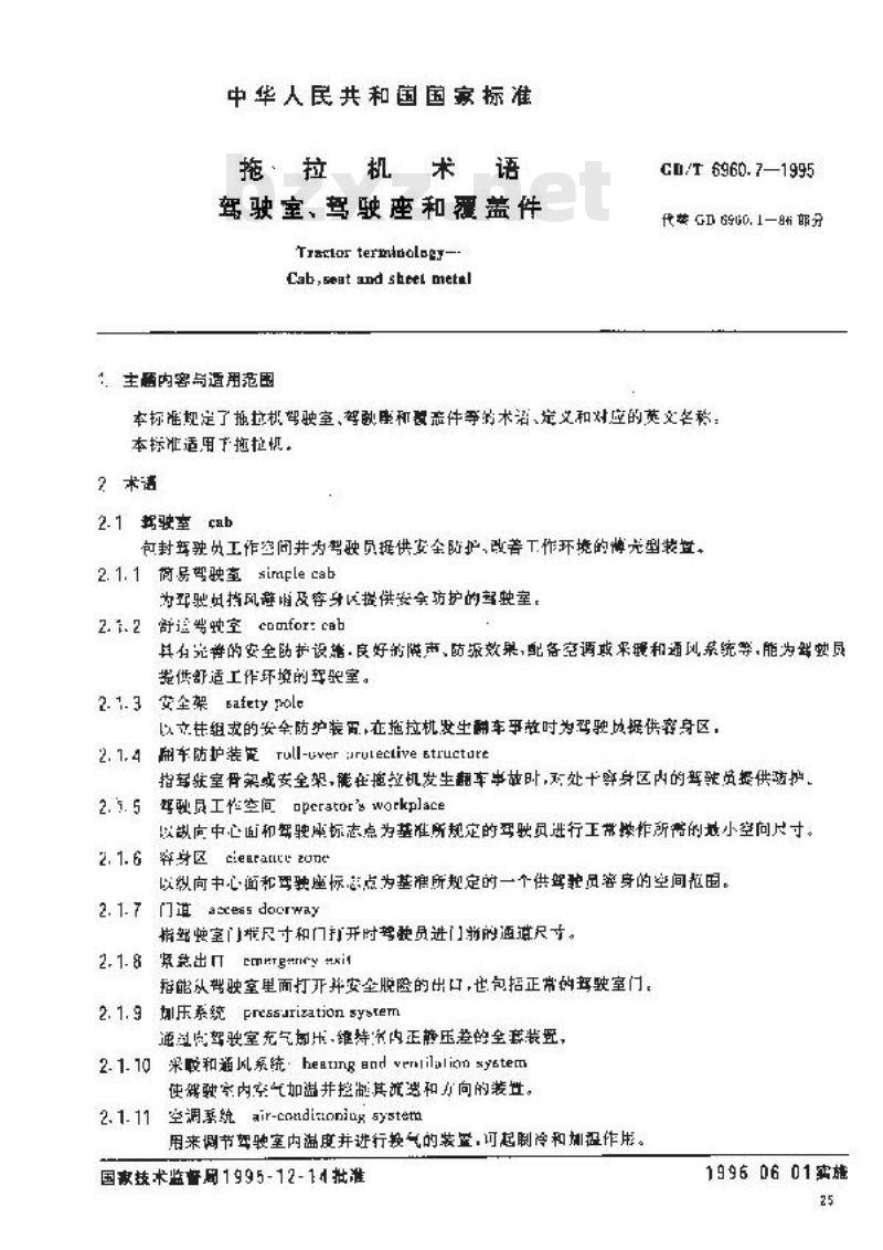 - GB/T 6960.7-1995 拖拉机术语 驾驶室、驾驶座和覆盖件